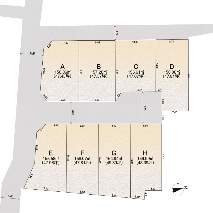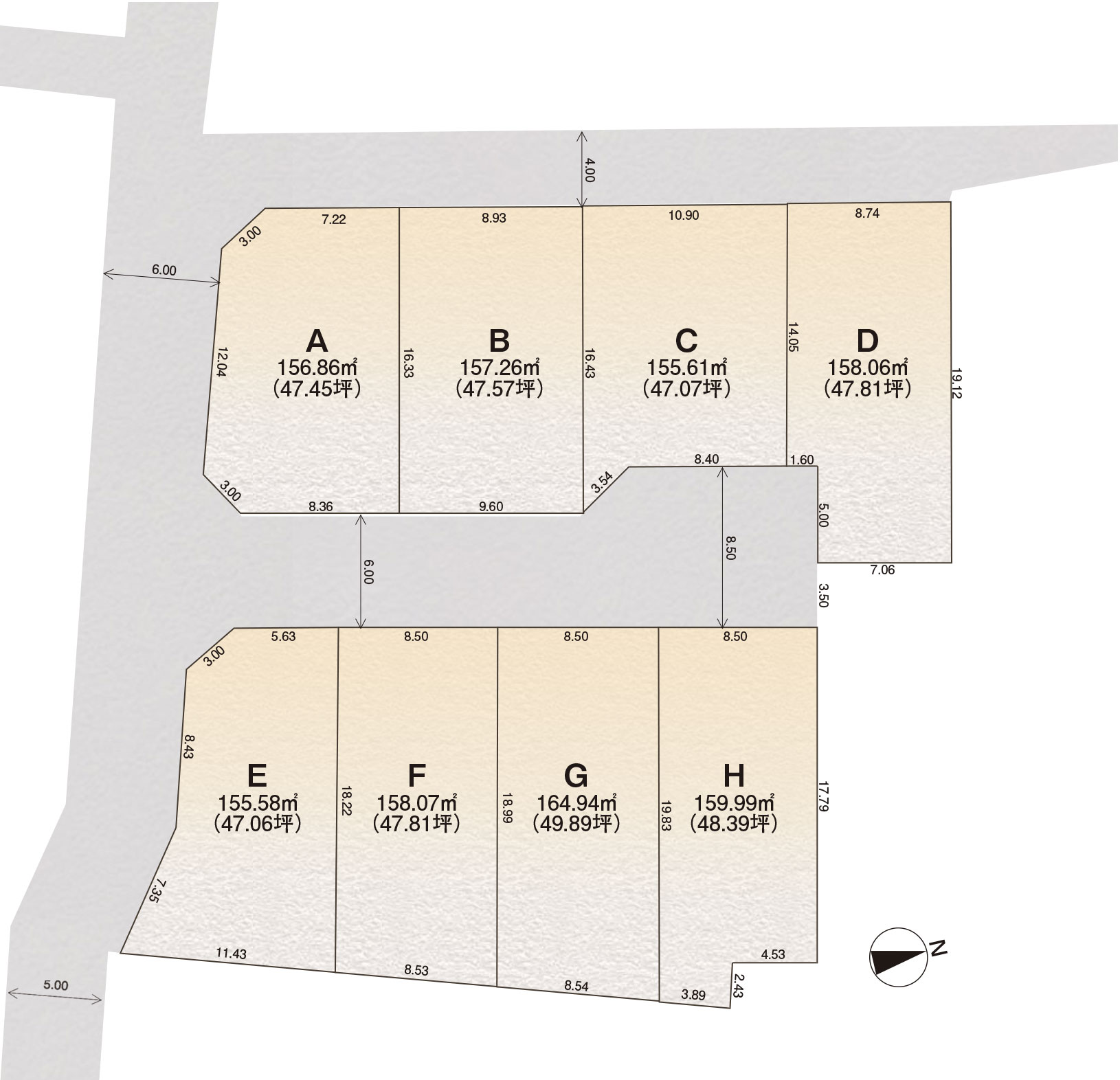 道幅6m〜8.5mの開発道路は向かい合わせの敷地との間に充分な距離を持たせ、プライバシーの確保にもなります。